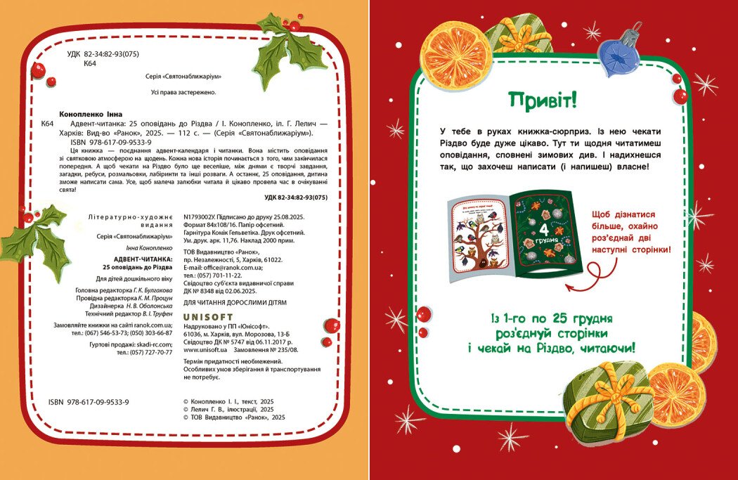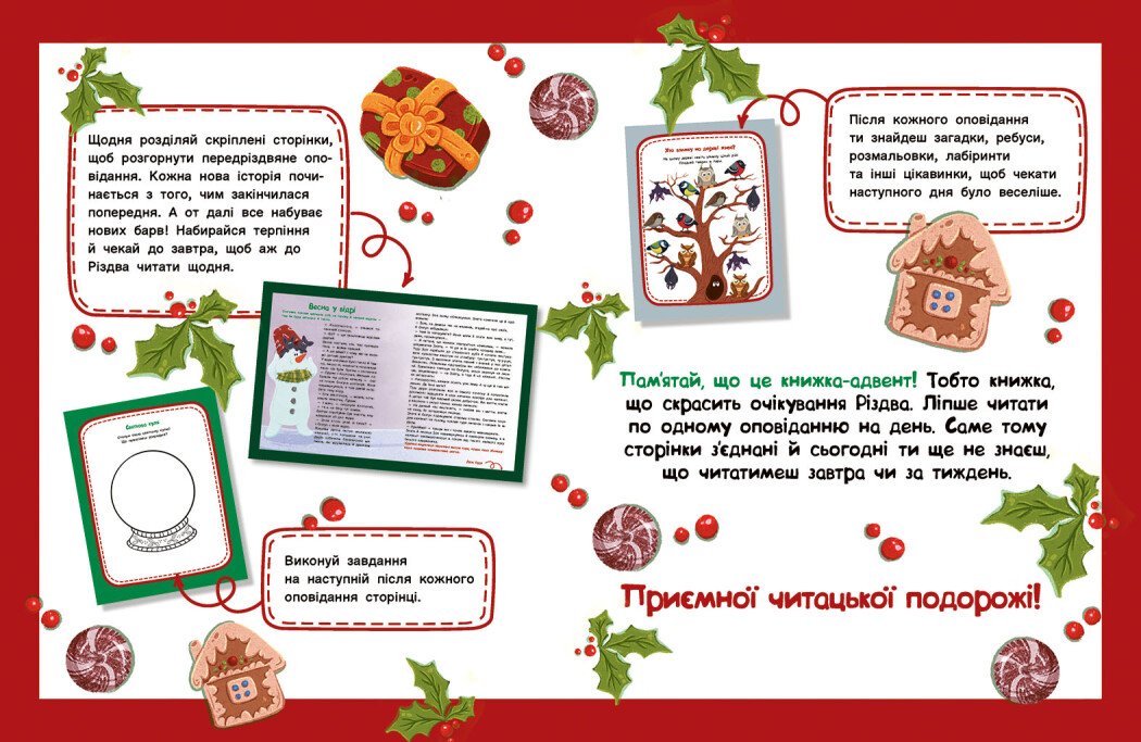 Дитина з нетерпінням чекає на зимові свята? Ця адвент-читанка зробить очікуванням особливим! У книжці є 25 різдвяних оповідань, де кожна нова історія починається з того, чим закінчилась попередня. Окрім затишних оповідок, тут є цікавезні завдання на щодень: загадки, розмальовки, ребуси й лабіринти.