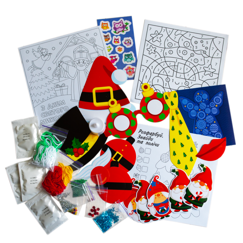 У наборі: адвент-календар, наліпки, штучна ялинкова гілка, дріт, електронна свічка, тканина, нитки, шпагат, намистини, бісер, волосінь, металеві кільця, голка, синтепон, стрічки, стрази, паєтки, дерев’яні палички, блискітки, клей ПВА, кольорові паперові смужки, деталі для фотосесії, заготовки ялинкових іграшок, розмальовки, цікаві завдання, блискуча мозаїка, трафарет для малювання на склі, картки для гри «Фанти», картки для гри «Хто я? Що я?», завдання для квесту, фоторамка-розмальовка, лист святому Миколаю, лист у майбутнє, папірці для жартівливого ворожіння, листівки, магнітна стрічка, деталі гірлянди, викрійки, поради для дорослих.