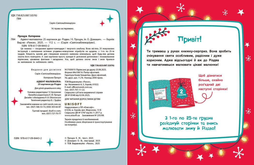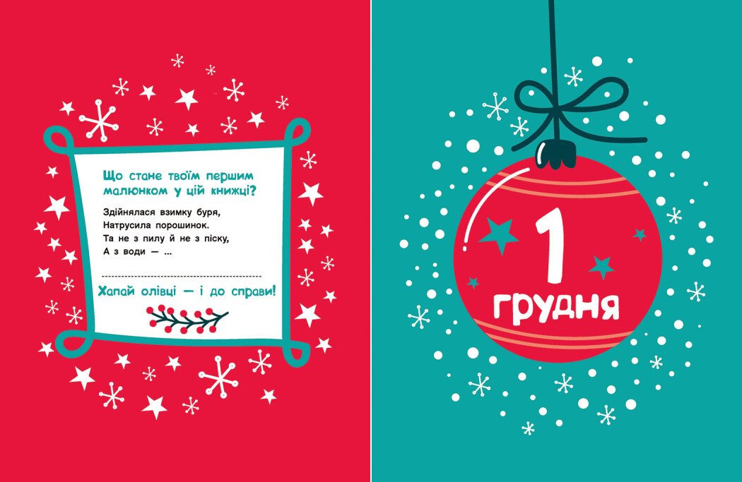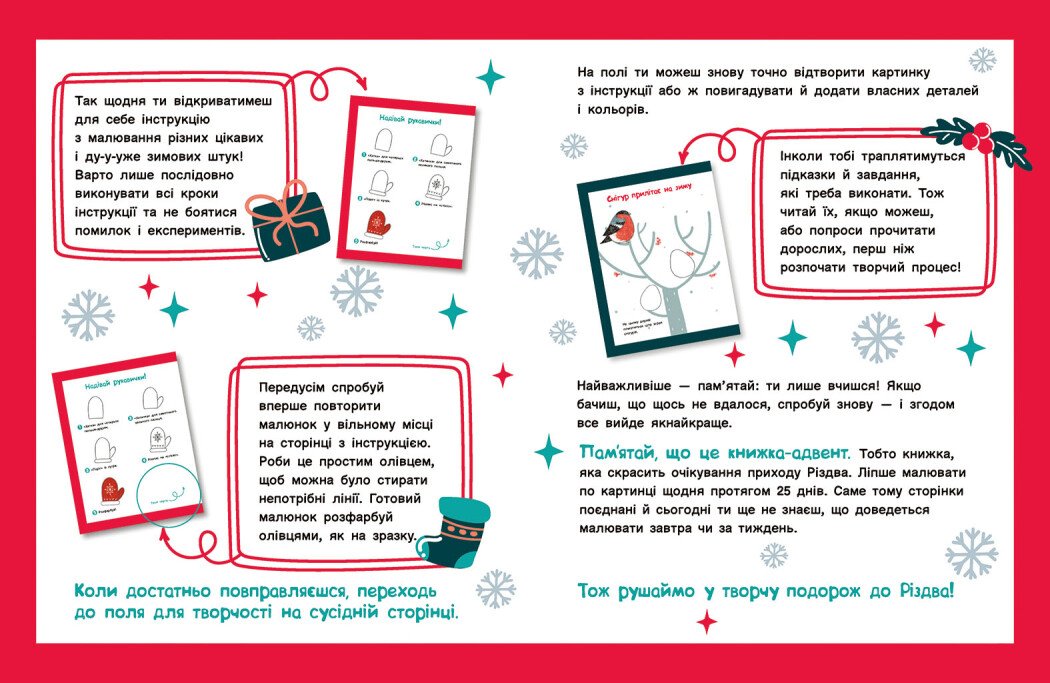 Зимові свята, які так обожнює малеча, уже зовсім скоро! А разом із ними — розваги й подарунки. Ну і як тут дочекатися?! Ця адвент-малювалка стане чудовим подарунком нетерплячим дітлахам і наблизить їх до святкування Різдва. Вона містить 25 покрокових інструкцій з малювання всіляких різдвяно-новорічних атрибутів на щодень: з 1-го по 25-те грудня. Так дитина не лише «наблизить» свято, а й розвине свої творчі здібності. А цікаві факти, загадки та кумедні підписи заохочуватимуть до малювання.