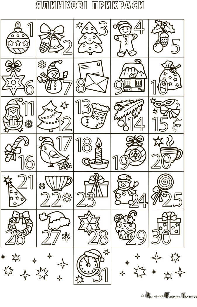 Адвент-календар у вигляді розфарбовки! Розфарбовуємо по одній ялинковій прикрасі кожного дня очікування.