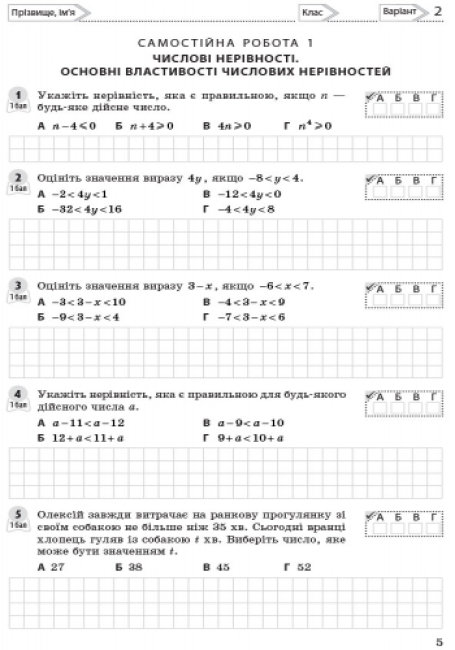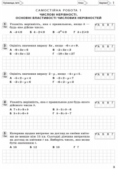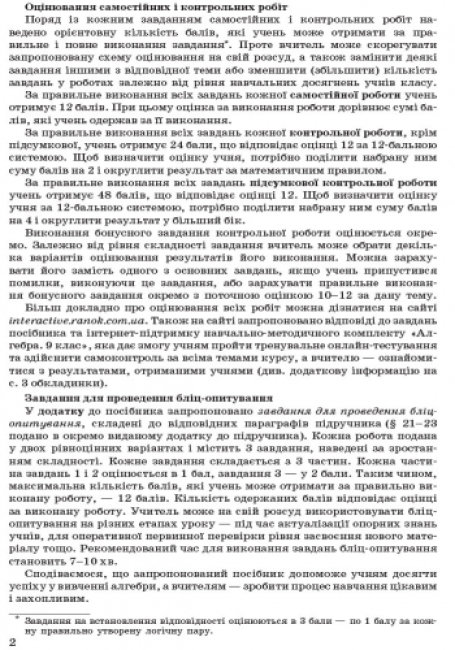 Посібник відповідає вимогам оновленої програми з математики для 9 класу загальноосвітніх навчальних закладів і призначений для організації регулярної діагностики, оцінювання та контролю навчальних досягнень учнів за кожною темою на основних етапах її засвоєння.