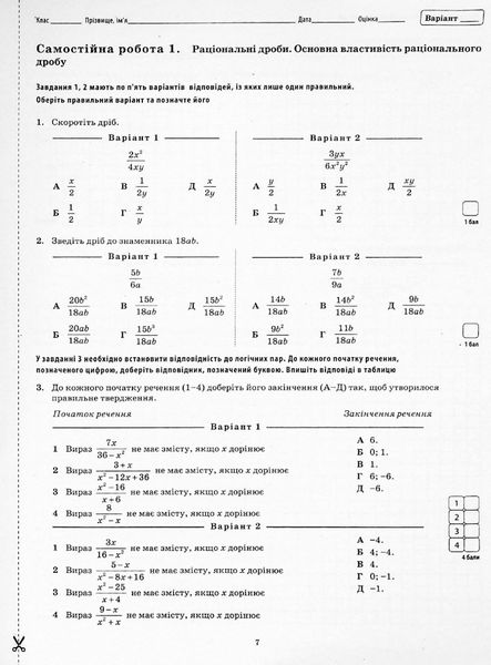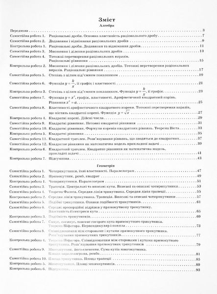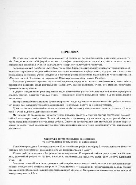Робочий зошит укладено відповідно до чинної навчальної програми з алгебри і геометрії, затвердженої Міністерством освіти і науки України. Мета створення цього посібника — не тільки допомогти вчителеві провести всі тематичні роботи протягом року, але й у ході вивчення теми, завдяки самостійним роботам, виявити рівень підготовки учня з пройденого матеріалу. Зошит може бути корисним і для підготовки до складання ДПА та ЗНО, оскільки містить теоретичні запитання і типові види завдань як для атестації, так і для оцінювання. Зошит розрахований на учнів загальноосвітніх навчальних закладів та вчителів алгебри і геометрії.