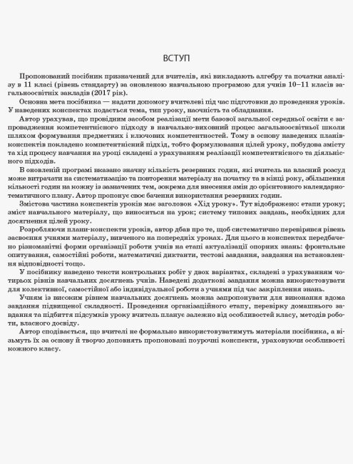 Пропонований посібник призначений для вчителів, які викладають алгебру і початки аналізу в 11 класі (рівень стандарту). У посібнику враховані зміни до навчальних програм, чинні з 1 вересня 2018 року.