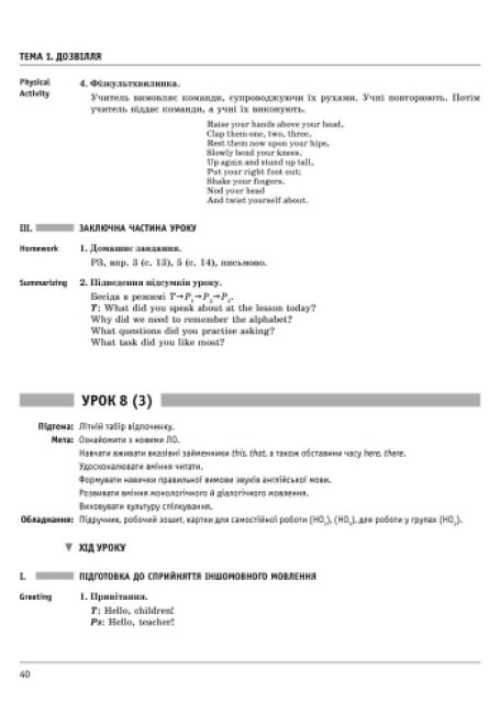 Посібник (автор Мясоєдова С.В.) являє собою плани-конспекти уроків англійської мови до підручника О. Д. Карп’юк для учнів 3-го класу. Побудований відповідно до чинної програми з англійської мови, затвердженої Міністерством освіти і науки України для загальноосвітніх навчальних закладів. Містить календарне планування та розробки 65 уроків, на яких застосовуються різноманітні форми й методи роботи з класом.