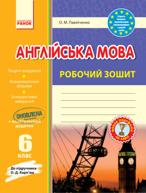 Робочий зошит, укладений до підручника О. Д. Карп’юк «Англійська мова. 6 клас», відповідає чинній програмі з іноземних мов для 6 класу загальноосвітніх навчальних закладів з урахуванням останніх змін. Різноманітні завдання ґрунтуються на комунікативному підході й призначені для більш детального опрацювання учнями навчального матеріалу на уроках і вдома. Виконання інтерактивних вправ, посилання на які пропонуються в зошиті*, сприятиме підвищенню інтересу школярів до вивчення англійської мови. У мовному портфоліо для самоконтролю навчальних досягнень втілені новітні світові тенденції мовної освіти.