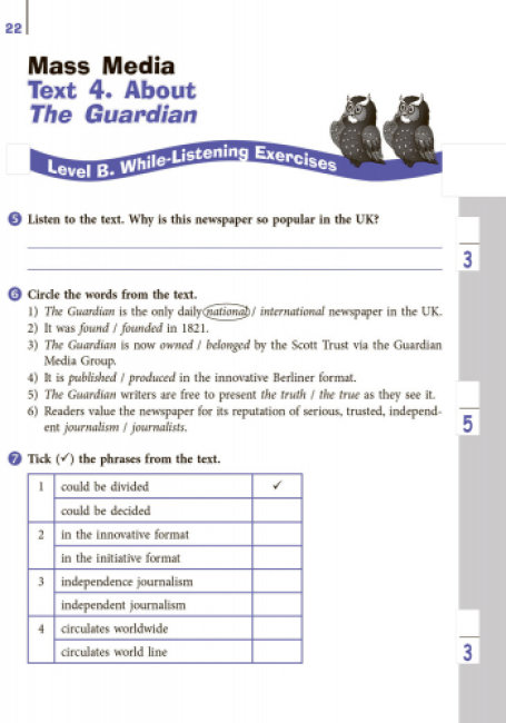 Зошит містить різноманітні вправи, спрямовані на формування й удосконалення навичок аудіювання — одного з основних видів мовленнєвої діяльності. Завдання носять випереджаючий характер, що є методично виправданим, оскільки відповідає реальному процесу оволодіння мовою. Весь матеріал посібника розподілений за трьома рівнями (А, В, С), які передбачають етап підготовки до аудіювання, власне аудіювання й етап перевірки розуміння змісту тексту. Матеріал дібрано з урахуванням вікових особливостей учнів, що буде сприяти підвищенню зацікавленості школярів у вивченні англійської мови як засобу спілкування з однолітками та розширенню їхнього кругозору. Для учнів 8 класів загальноосвітніх навчальних закладів, учителів англійської мови.