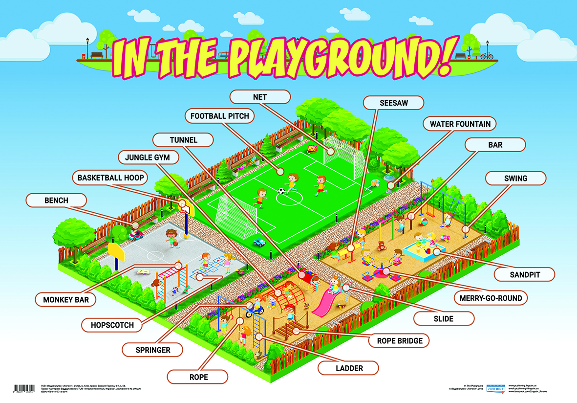 плакату «In the Playground», який розроблений для вивчення лексики по темах «Ігровий майданчик» та «Іграшки»;