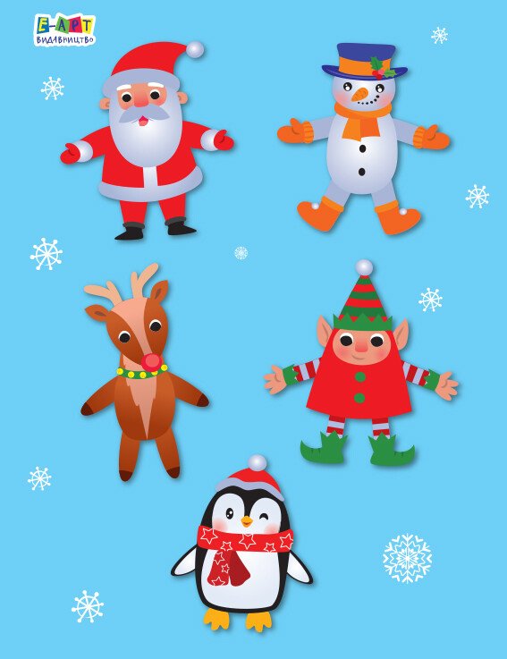 “Санта і його друзі” – набір для аплікацій. Ви створите 5-х друзів Санти: самого Чарівника, оленя, ельфа, пінгвіна, сніговика. Аплікації можуть стати прикрасою куточка дитини або основою святкової листівки.