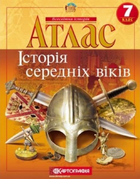 Атлас. Всесвітня історія. 7 клас. Історія середніх віків. Картографія. 978-966-946-282-4 Видання має гриф Міністерства освіти і науки України та відповідає санітарному законодавству України.