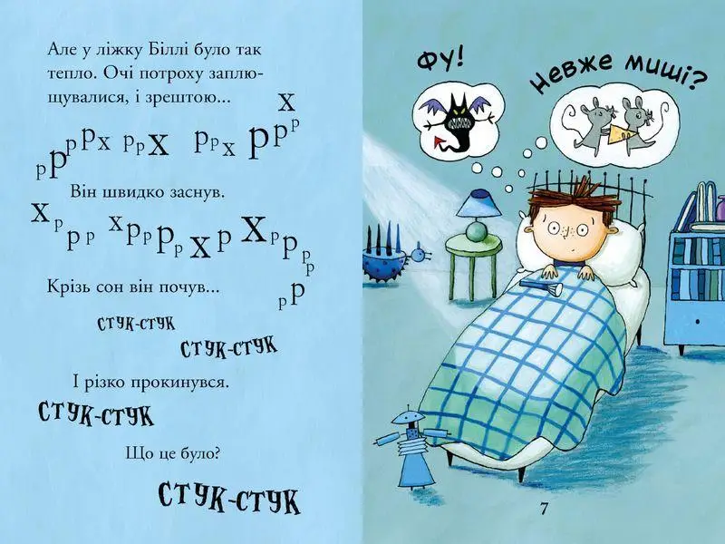 Біллі вирішує: треба не спати вночі, і тоді моторошні монстри до нього не прийдуть. Аж раптом він чує який тихий писклявий голос, а тоді помічає дивні фіолетові сліди. А ще хтось напав на його бутерброд! І в шафі пахнуть зовсім не його шкарпетки… Смішна історія для найменших читачів, що допоможе боротися із дитячими страхами. Бо всім відомо: найкраща зброя проти страху – це сміх!