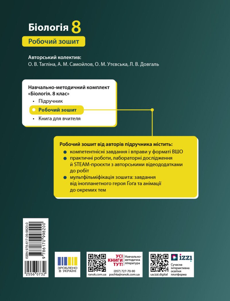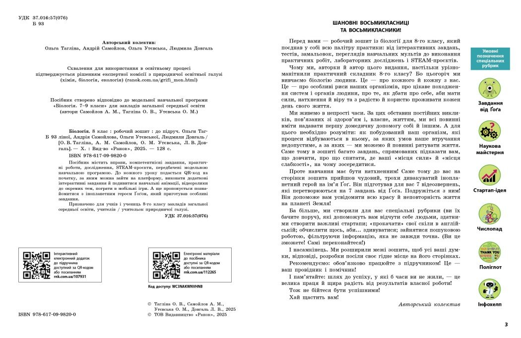 Цей робочий зошит укладено відповідно до параграфів підручника й доповнює його, надаючи можливість застосувати на практиці отримані знання. Тут є різноманітні компетентнісні завдання, творчі задачки й навіть невеликі експерименти! Зошит стане надійним супутником під час роботи на уроці та при виконанні домашніх завдань, допоможе учням і ученицям пізнати біологію та перетворить навчання на захопливу подорож!; Передмова