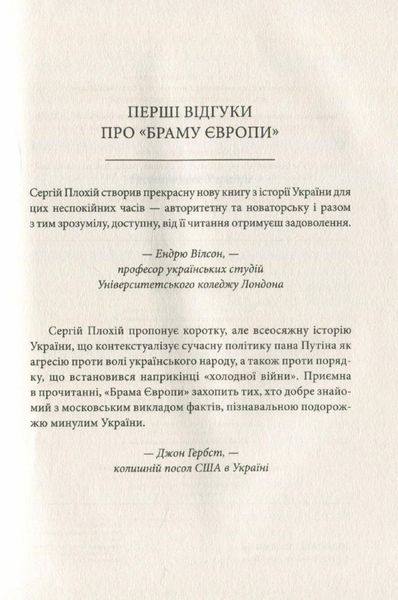 Оновлене та Доповнене Видання Автор книги Сергій Плохій — професор Гарвардського університету, один з провідних спеціалістів світу з історії України та Східної Європи. За книгу «Брама Європи» отримав національну премію імені Тараса Шевченка в номінації «Публіцистика». • Спеціальний проєкт до 25-річчя Незалежності • За масштабом та науковою цінністю «Брама Європи» стоїть поряд із творами Грушевського Книга цікаво й доступно розповідає про історію нашої держави від часів Геродота до подій на Сході України сьогодні. Це авторитетне видання допоможе краще зрозуміти події минулого, а через них — і наше сьогодення. Автор фокусує увагу на українцях як найбільшій демографічній групі, а згодом — головній силі, що стояла за створенням сучасної нації. Дізнайтеся, як наші предки «призвали варягів на царювання», як наша країна боролася за право бути незалежною, пройшла крізь часи кріпацтва, комуністичного терору й Голодомору, Другої світової війни та врешті-решт отримала незалежність.