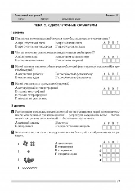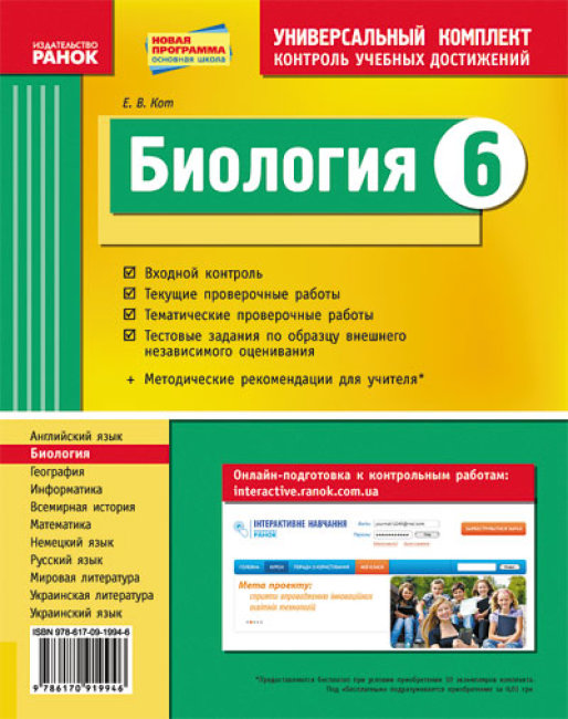 Универсальный комплект (автор Кот Е. В. ) предназначен для проверки знаний учащихся по биологии. Он составлен в соответствии с действующей программой Министерства образования и науки Украины. Комплект содержит задания входного, а также текущего и тематического контроля знаний.