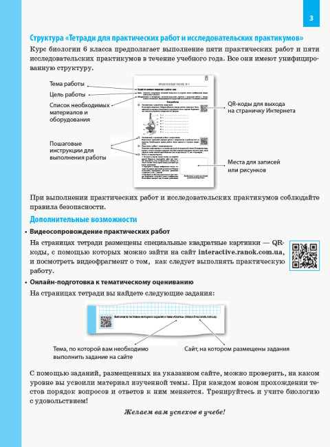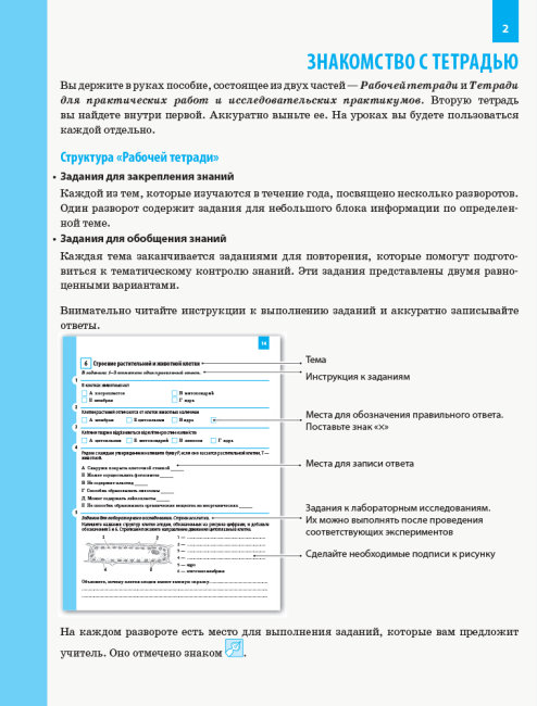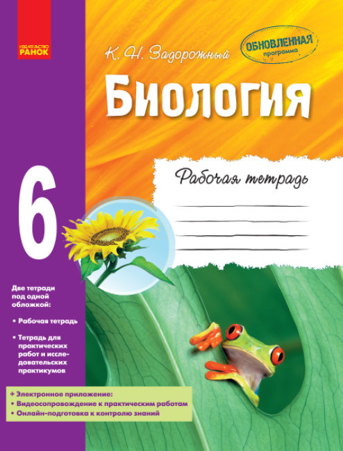 Пособие (автор Задорожный К.Н.) составлено в соответствии с действующей программой по биологии для 6 класса общеобразовательных учебных заведений. Он состоит из двух частей — рабочей тетради и тетради для практических работ. Рабочая тетрадь содержит разнообразные задания для работы на уроке и дома. В конце каждой темы помещены задания для обобщенных знаний, представлены в двух вариантах. Подготовиться к контролю знаний можно с помощью онлайн тестов на странице Интернета, ссылка на которую есть в тетради. Тетрадь для практических работ содержит разработки всех практических работ, предусмотренных программой. К некоторым из них есть ссылка на страницу Интернета с видео, демонстрирующее выполнения работы.