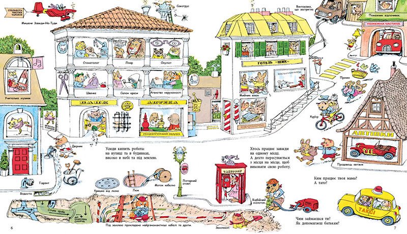 Річард Скаррі запрошує маленьких читачів у подорож містом, де кожен його мешканець щось робить! Від будівельників і пожежників до лікарів і фермерів — діти дізнаються, як працюють різні професії та яку роль вони відіграють у повсякденному житті.