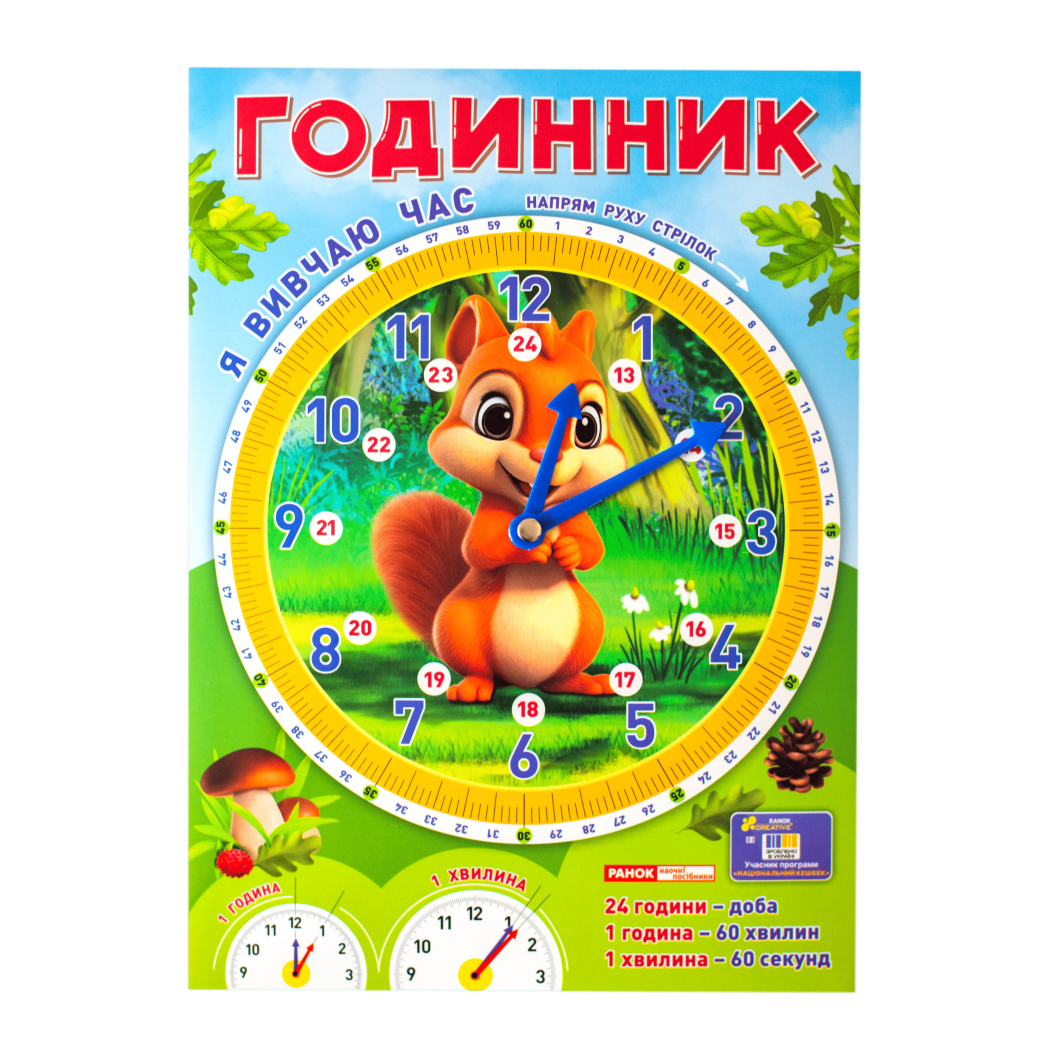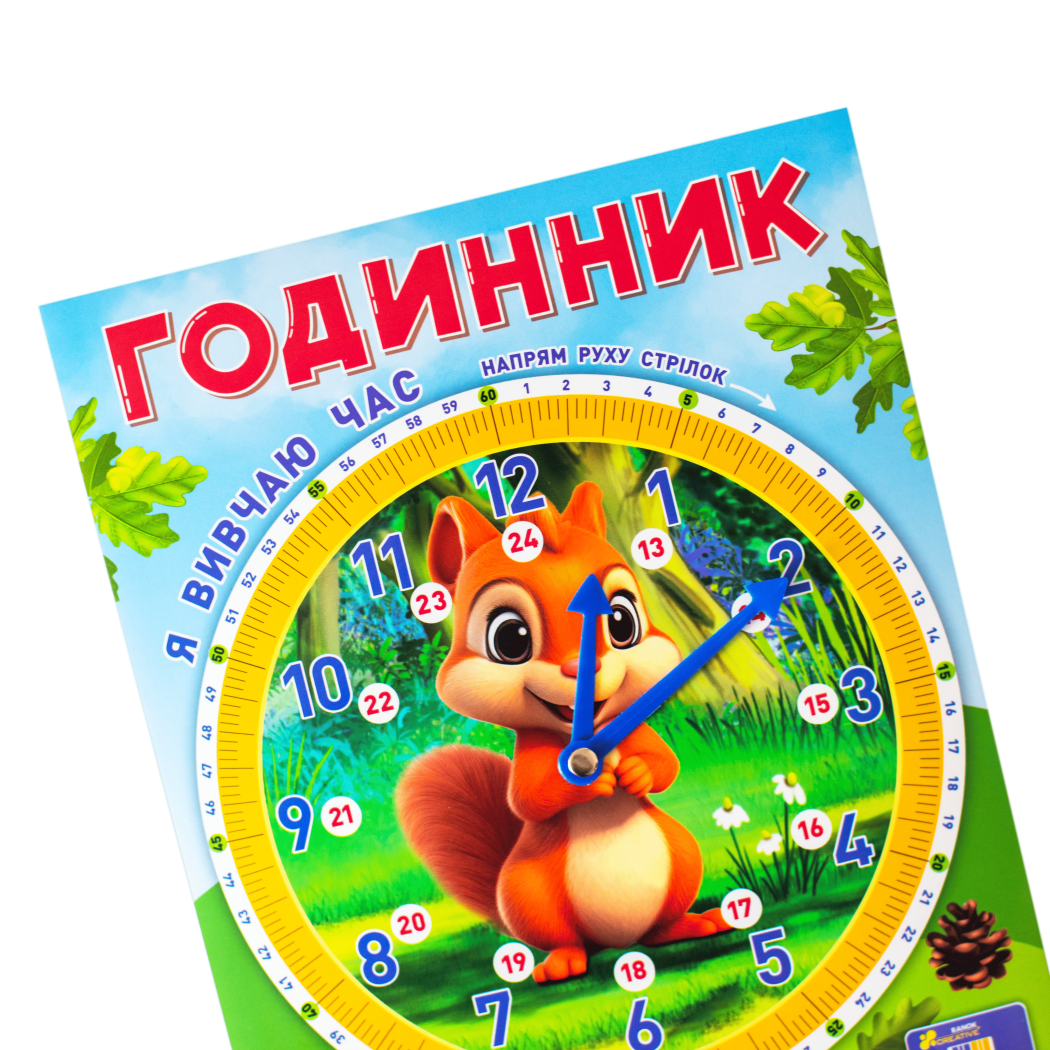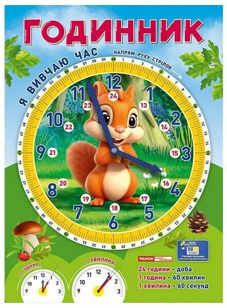 Яскравий годинник із милою білочкою створює позитивну атмосферу та заохочує дитину до навчання через гру.