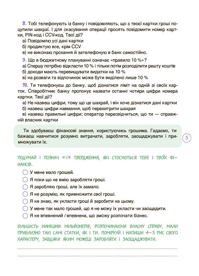 Опрацювавши корисні, цікаві та різноманітні завдання про фінанси, їх заощадження і використання, ти закладеш міцну основу для будування фундаменту фінансової грамотності. Корисні завдання та запитання для роздумів допоможуть тобі: