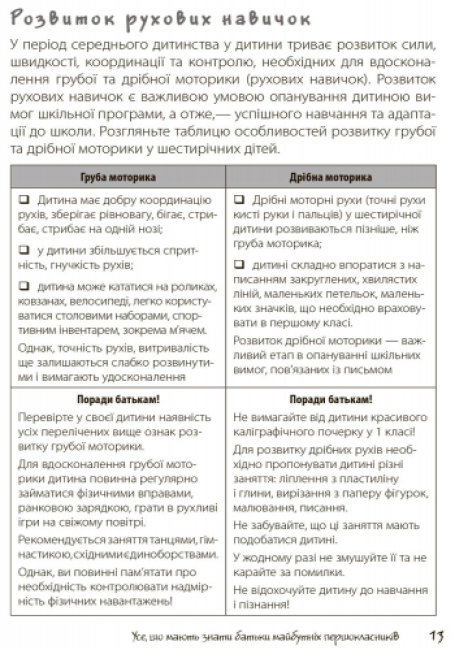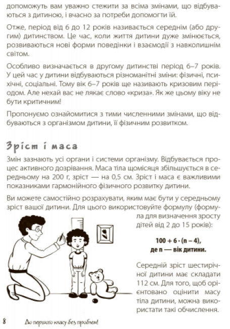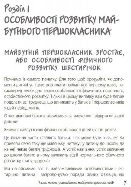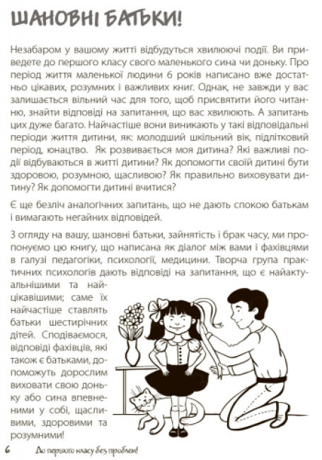 Дитина йде до першого класу. Звісно, у батьків виникає безліч запитань: «Як обрати школу?», «У якому віці краще віддавати малюка до школи?», «Що таке „Шкільна зрілість?”», «Як допомогти дитині вчитися?» тощо. Творча група практичних психологів дають відповіді на запитання, що найактуальнішими та найцікавішими; саме їх найчастіше ставлять батьки шестирічних дітей. Відповіді фахівців, які також є батьками, допоможуть дорослим виховати свою доньку або сина впевненими у собі, щасливими, здоровими та розумними!