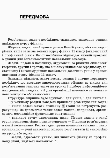 Збірник відповідає чинній програмі з фізики для 11 класу (академічний і профільний рівні), містить задачі трьох рівнів складності.