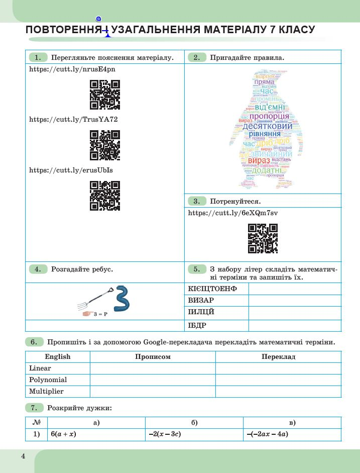 Цей зошит створено як інтерактивний інструмент для глибшого опанування тем з математики. Його мета – не лише допомогти учням засвоїти математичні знання, а й розвивати уміння мислити, аналізувати, досліджувати, співпрацювати й застосовувати математику в повсякденному житті. Структура зошита побудована так, щоб чергувалися різні типи діяльності: практичні завдання, творчі вправи, ребуси, проєкти. QR-коди тестів та відео полегшують підготовку до уроку. Крім того, після кожного завдання є рефлексія діяльності, що надає можливість проаналізувати труднощі. Завдання можуть бути використані і під час уроків, і для самостійної роботи, домашніх завдань або проєктної діяльності.
