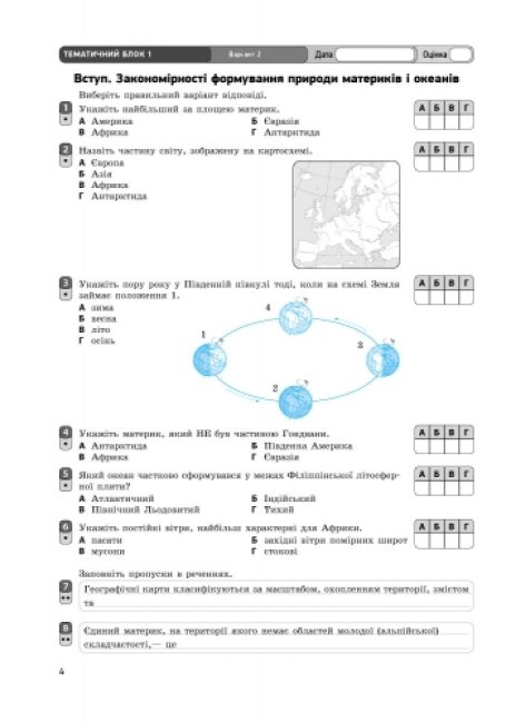 Матеріали окремих варіантів узагальнюючого контролю об’єднуються у структурно-логічні тематичні блоки, кожен з яких відповідає визначеній темі або розділу навчальної програми з географії 7 класу.У посібнику вони розміщуються в тому самому порядку, як і в чинній навчальній програмі, що
