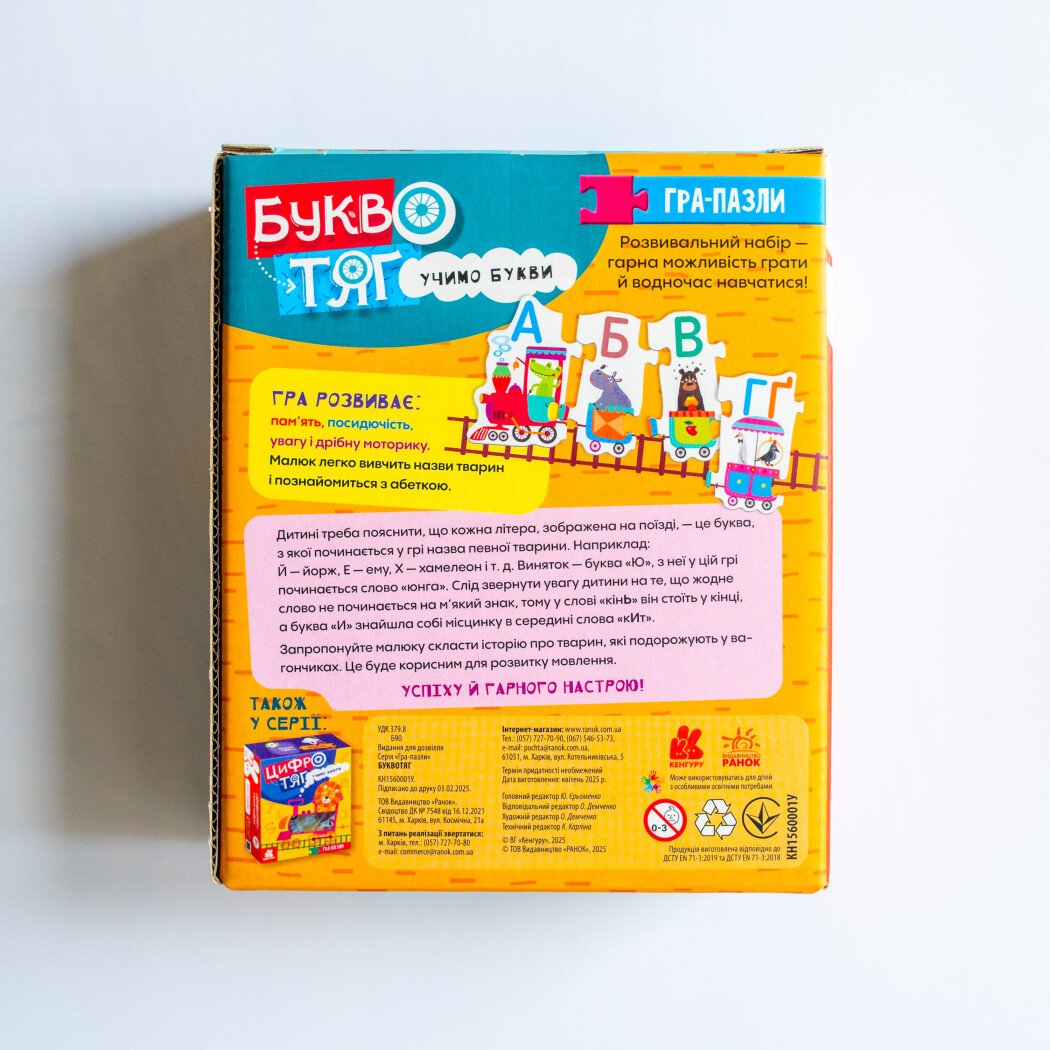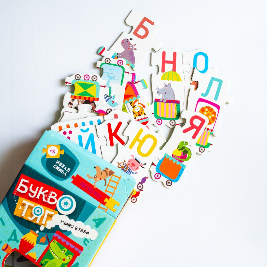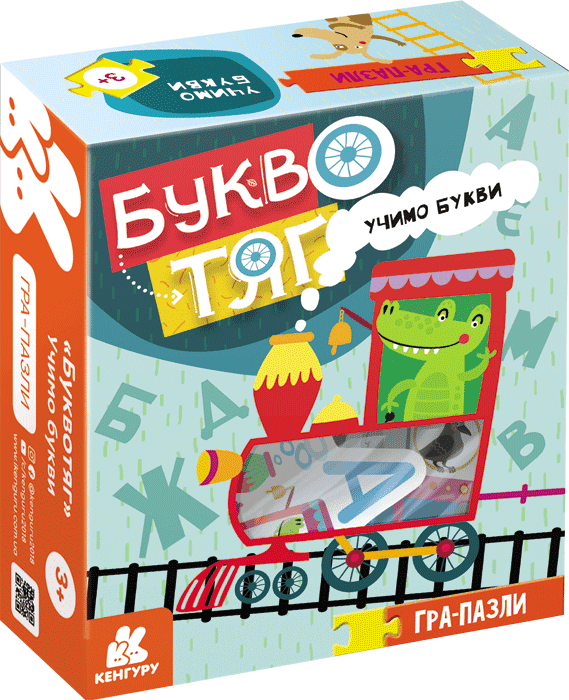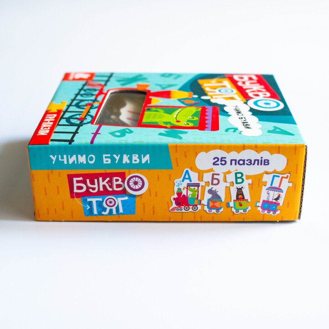 «Буквотяг» — це яскрава навчальна гра-пазл, яка допомагає малюкам зробити перші кроки у світ українських літер. 25 кольорових елементів складаються у веселий потяг, де кожен вагончик має свою букву (або кілька літер) та знайомить дитину з відповідним словом і зображенням.