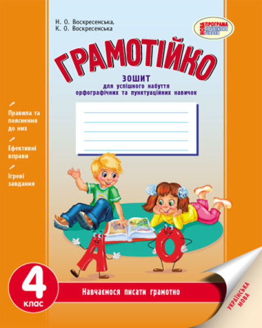 Навчальний матеріал (автор Воскресенска Н.О.), запропонований у серії посібників «Грамотійко», покликаний сприяти виробленню в учнів 2—4 класів орфографічних та пунктуаційних умінь і навичок, відповідає вимогам чинної програми з української мови для загальноосвітніх ¬навчальних закладів.