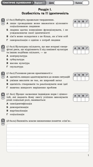 Посібник містить завдання для тематичного, семестрового та річного оцінювання результатів навчання учнів 10-х класів з курсу «Громадянська освіта (рівень стандарту)».