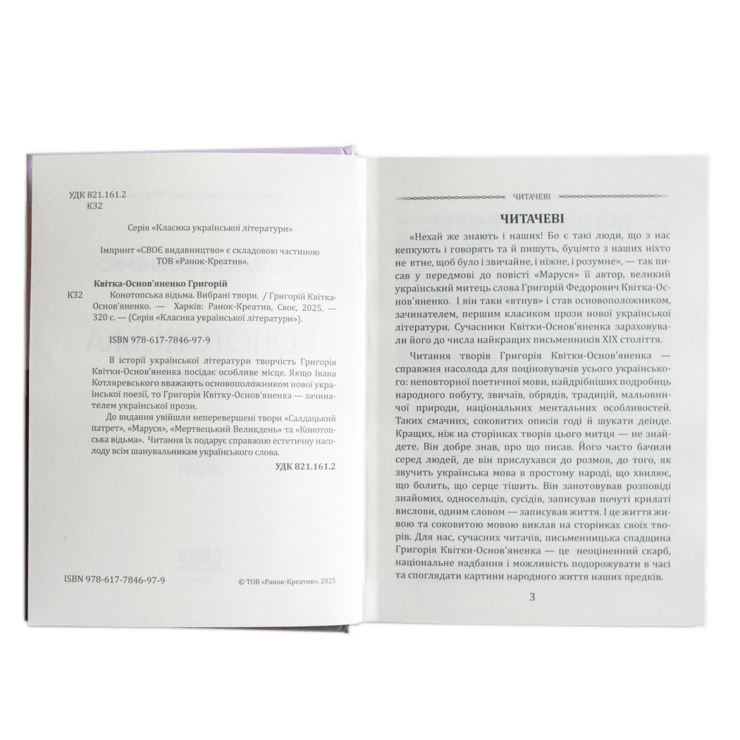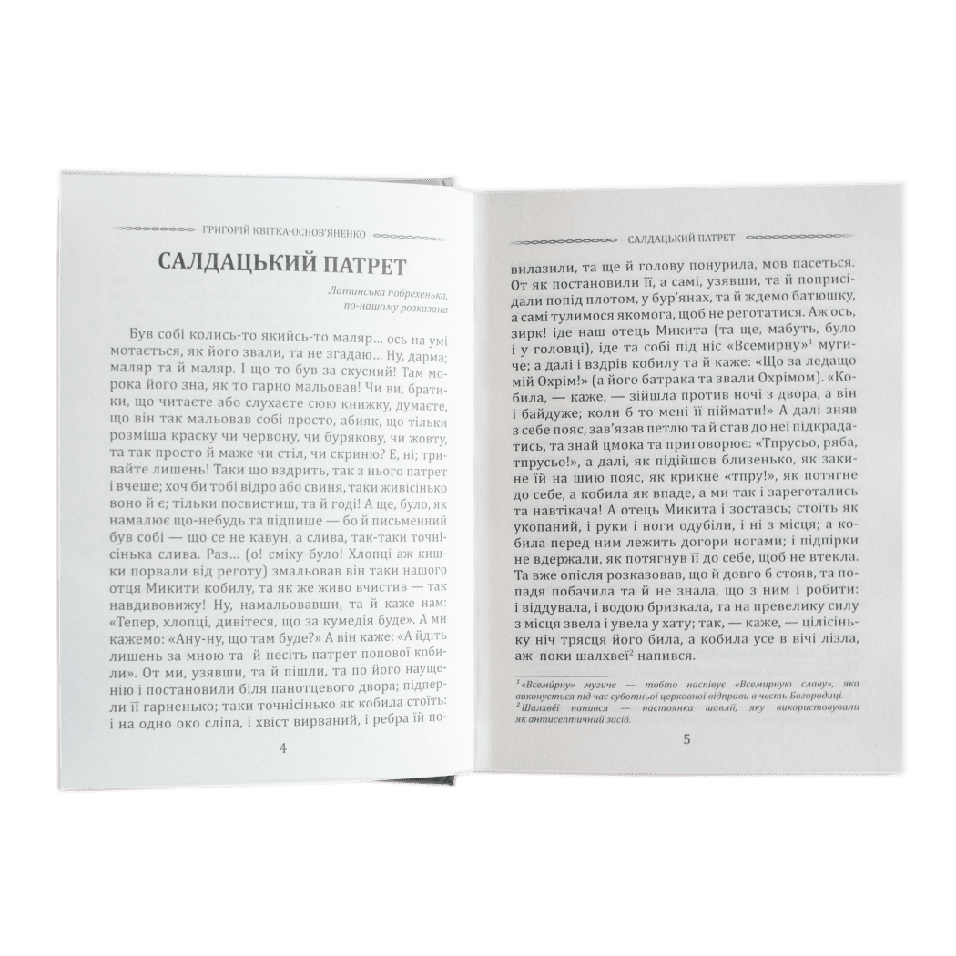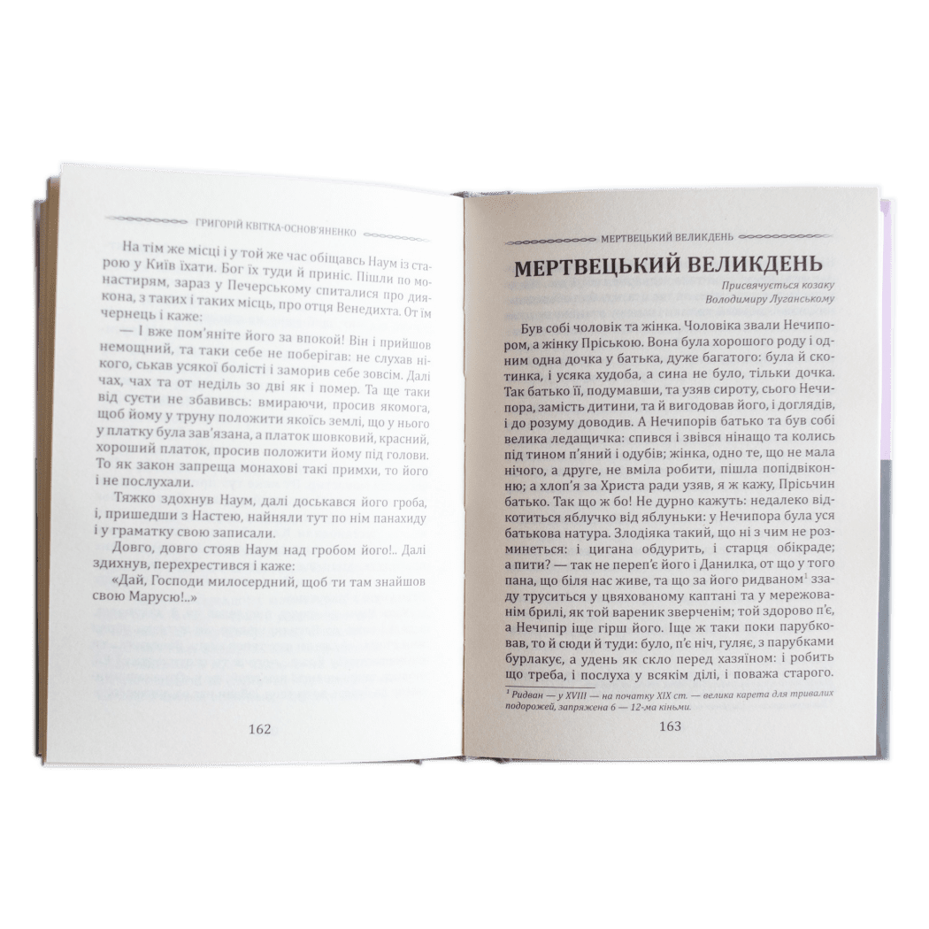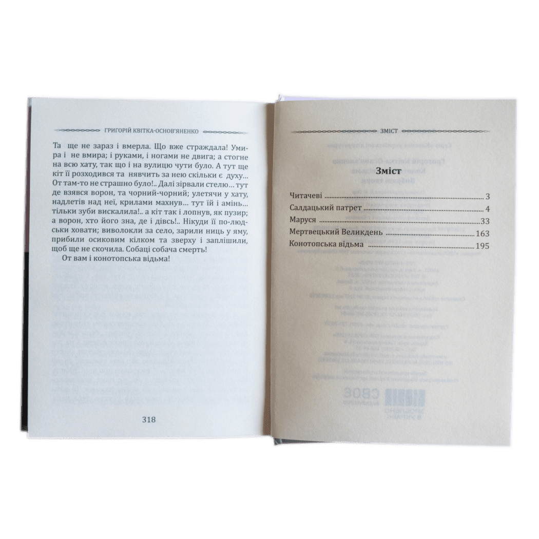 Ця збірка відкриває перед читачем багатий світ української прози — емоційної, глибокої та колоритної. У ній зібрані найвідоміші твори Григорія Квітки-Основ’яненка: «Маруся», «Конотопська відьма», «Салдацький патрет» та «Мертвецький Великдень». Кожен твір наповнений народною мудрістю, побутом, гумором і живою душею українського життя, і захоплює як школярів, так і дорослих.