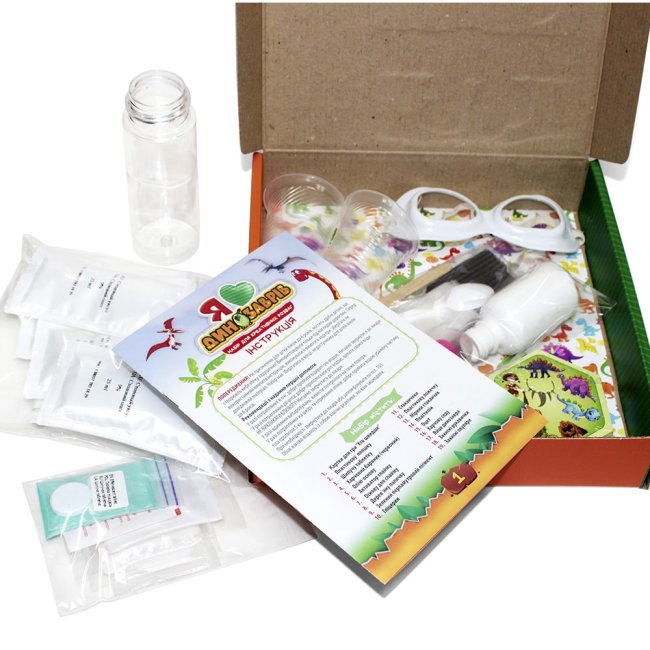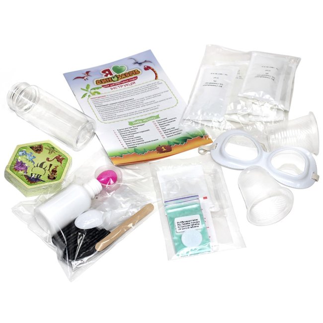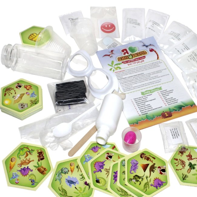 Комплектація: картки для гри «Хто швидше», пластикова пляшка, шипуча таблетка, харчовий барвник (червоний), олію-основа, дерев’яна паличка, зелений перламутровий пігмент, гліцерин, стаканчики, пластикова ложечка, мірний стаканчик, пластилін, оцет, харчова сода, яйце динозавра, захисні рукавички, захисні окуляри.