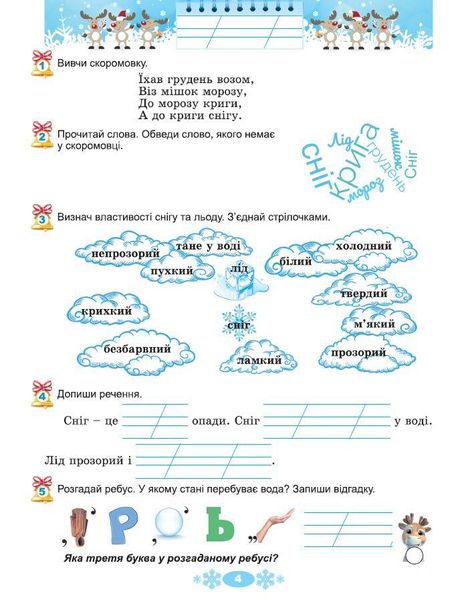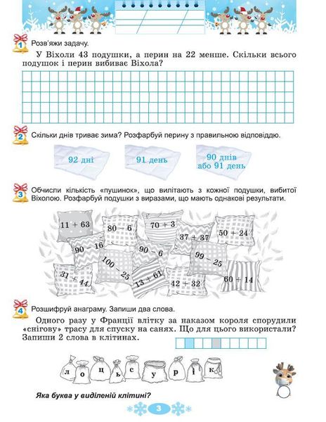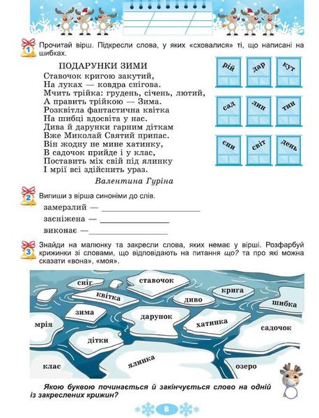 Серія Зимові канікули в НУШ. Посібник для 2 класу. У посібнику запропоновано інтегровані завдання навчального та розвивального характеру у формі квесту, які відповідають концепції Нової української школи й освітній програмі для 2 класу. Провідні персонажі – олені Санти – допоможуть школярам весело, цікаво та змістовно провести зимові канікули, поєднати відпочинок з інтелектуальним розвитком, повторити вивчений матеріал та підготуватися до наступного навчального семестру. Завдання посібника розраховані на щоденну роботу впродовж зимових канікул.