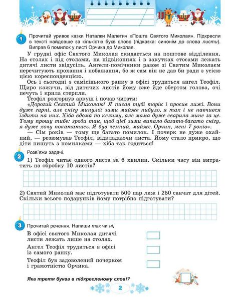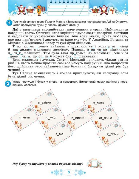Серія Зимові канікули в НУШ. Посібник для 3 класу. У посібнику запропоновано інтегровані завдання навчального та розвивального характеру у формі квесту, які відповідають концепції Нової української школи й освітній програмі для 1 класу. Провідний персонаж – Святий Миколай – допоможе школярам весело, цікаво та змістовно провести зимові канікули, поєднати відпочинок з інтелектуальним розвитком, повторити вивчений матеріал та підготуватися до наступного навчального семестру. Завдання посібника розраховані на щоденну роботу впродовж зимових канікул.