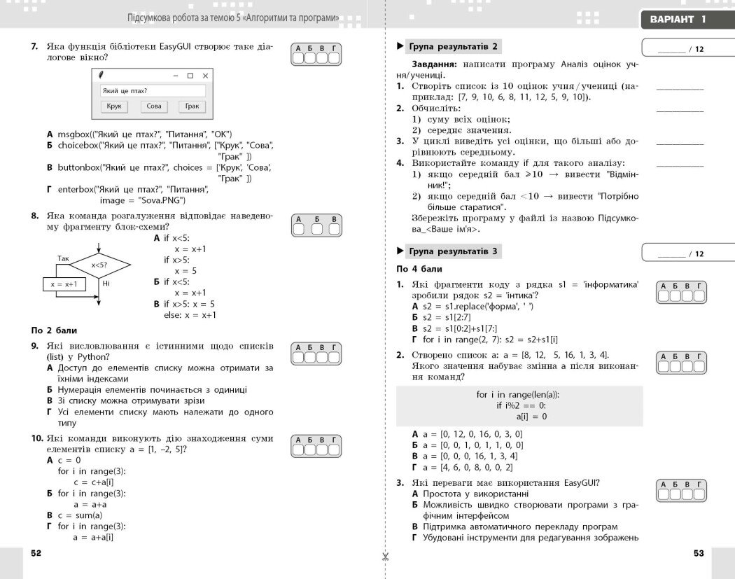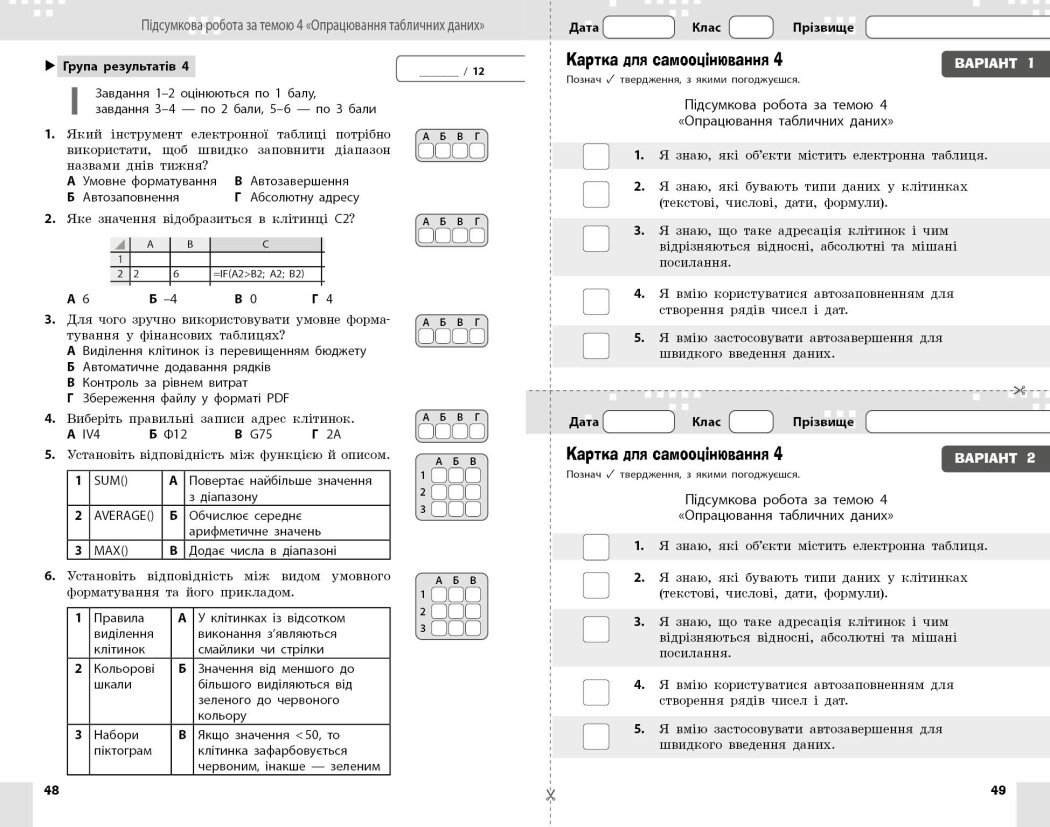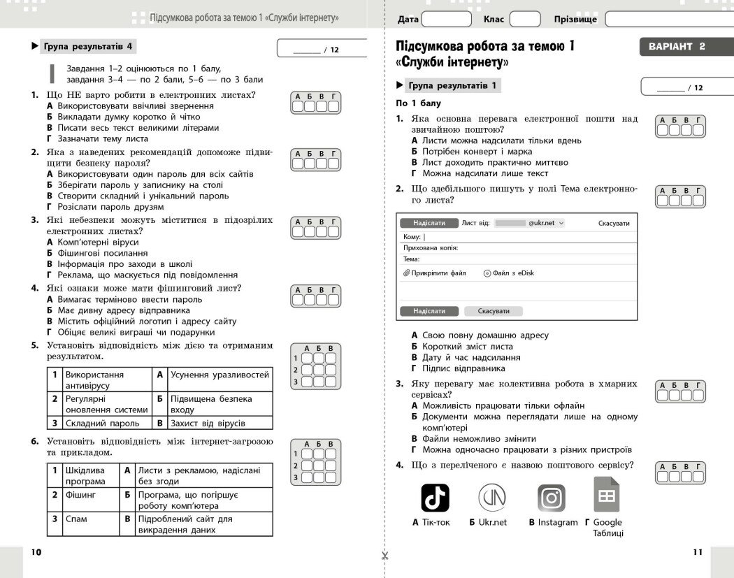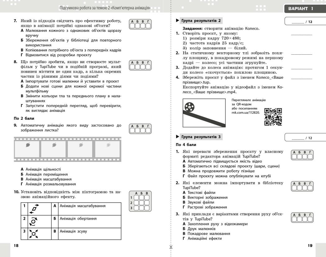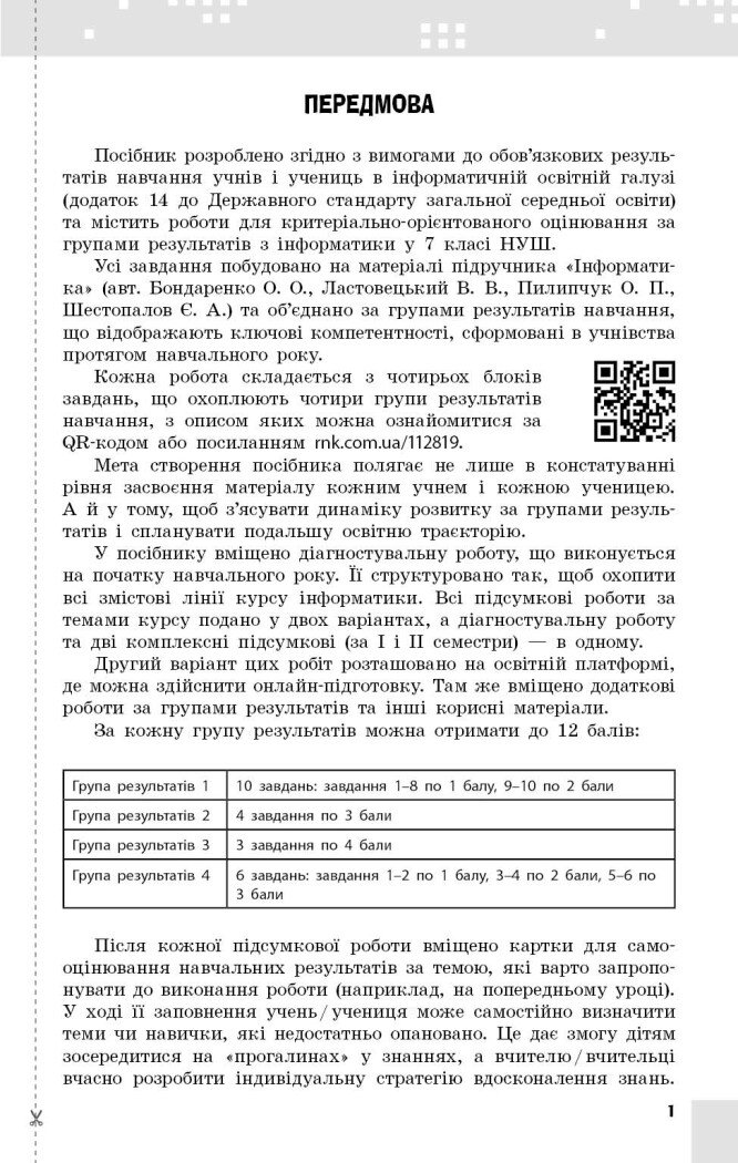 Посібник містить роботи для критеріально-орієнтованого оцінювання за групами результатів з інформатики у 7 класі НУШ: діагностувальну роботу на початку року, підсумкові роботи за темами, комплексні підсумкові роботи (за І та ІІ семестри), а також картки для самооцінювання. Кожна робота складається з чотирьох блоків завдань, які охоплюють чотири групи результатів навчання.Другий варіант діагностувальної роботи, комплексних підсумкових робіт за семестри та поточні інтерактивні роботи за групами результатів доступні за QR-кодом або посиланням. Призначено для учнів і учениць 7 класу закладів загальної середньої освіти, вчителів і вчительок інформатики.