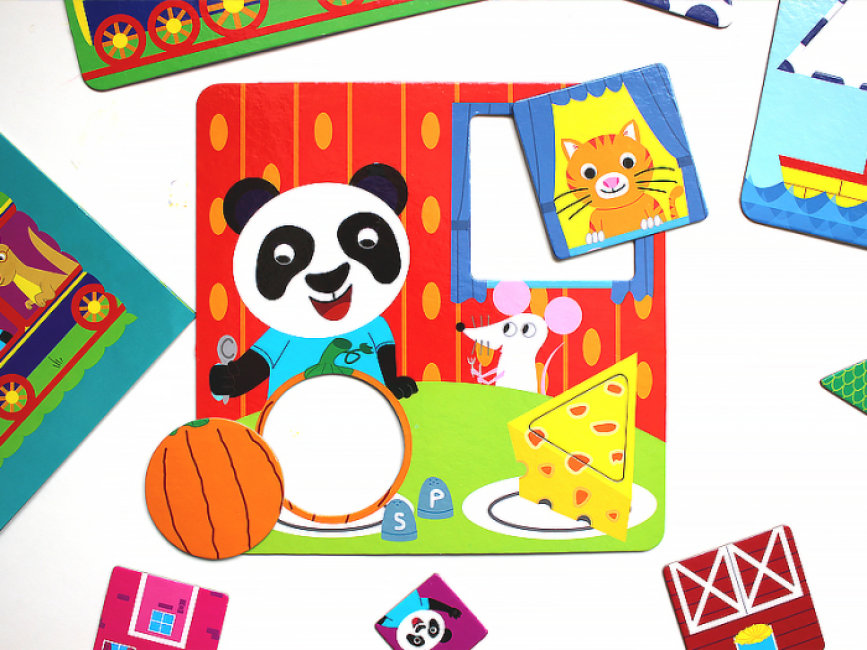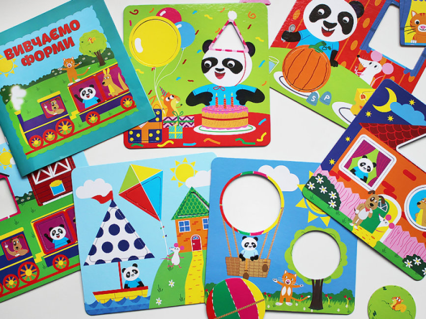 У наборі 6 карток 20х20 см. Кожна картка має свій сюжет і включає пазли у вигляді трикутника, кола та квадрата, які дитина може легко зібрати.