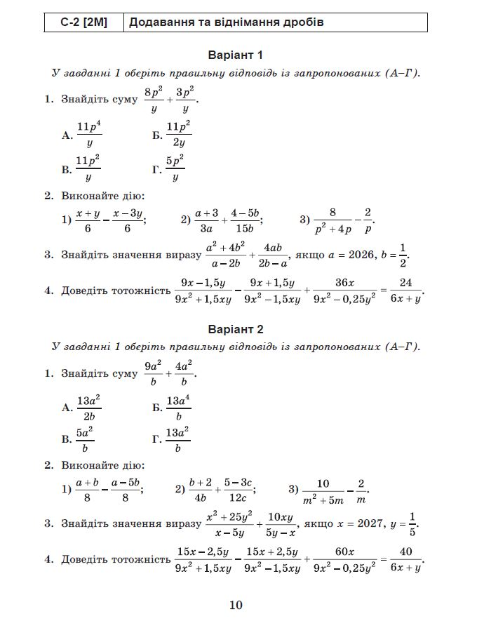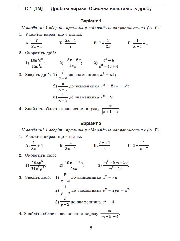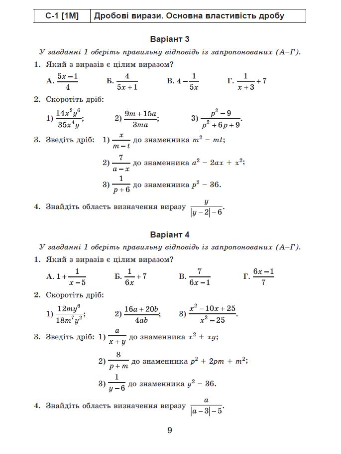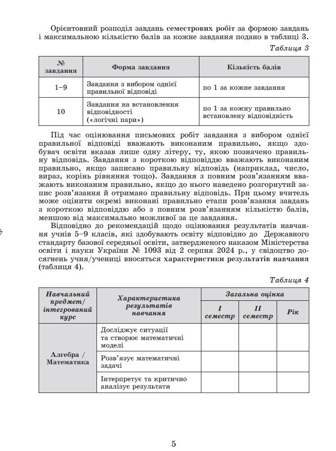 Посібник містить добірку самостійних, тематичних діагностичних (контрольних), семестрових і підсумкової письмових робіт для перевірки й оцінювання результатів навчання, зміст яких відповідає модельним навчальним програмам «Алгебра. 7–9 класи» і «Математика (інтегрований курс). 7–9 класи» (автор О.С. Істер) та критеріям оцінювання з математики. Семестрові роботи подано у 2-х варіантах, усі інші роботи – у 4-х однотипних варіантах.