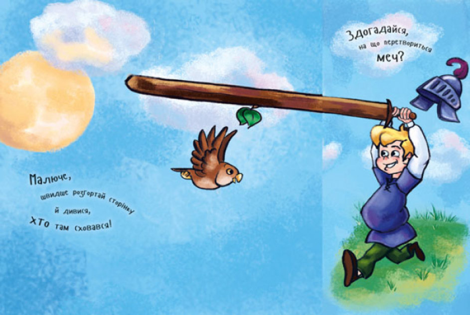 Малюче, у цій книжці ти знайдеш небагато кумедних чар. Розгорни розкладайку і ти побачиш, як самокат перетворюється на підводний човен! Тепер спробуй відгадати, що з’явиться слідом за субмариною. Грай з книжкою і вигадуй історії про незвичайні перетворення!