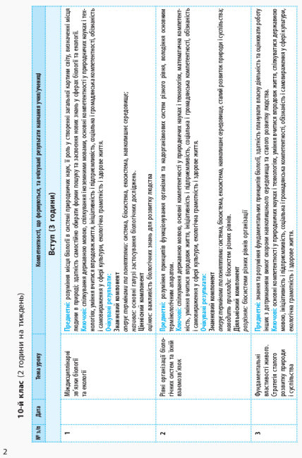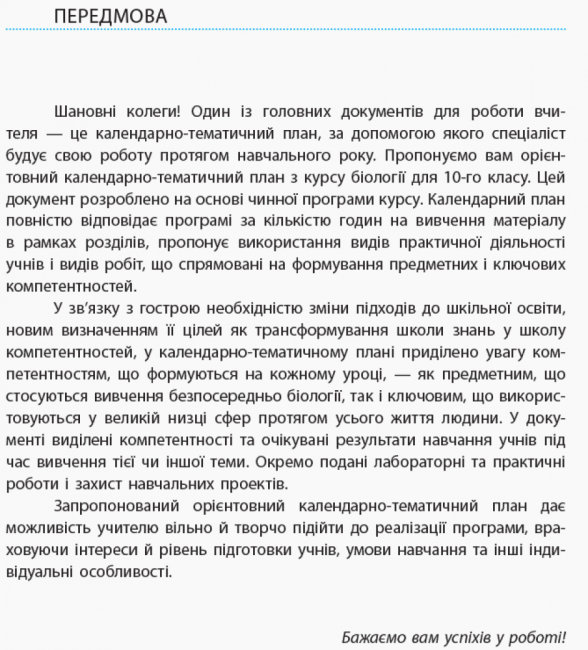 Запропонований календарно-тематичний план розроблено відповідно до навчальної програми з біології і екології для 10 класу з урахуванням провідних ідей особистісно орієнтованого і компетентісного підходів у навчанні.