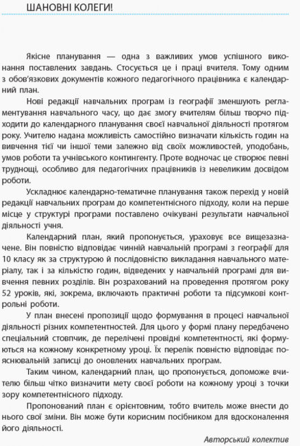 Запропонований календарно-тематичний план розроблено відповідно до навчальної програми з географії для 10 класу з урахуванням провідних ідей особистісно орієнтованого і компетентісного підходів у навчанні.