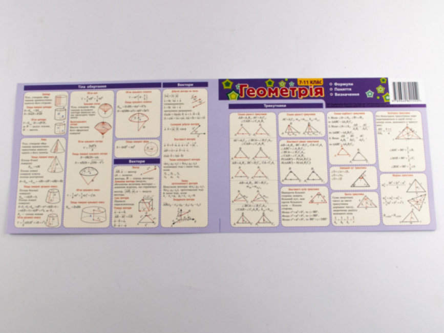 Картонка-підказка містить: формули. поняття, визначення з геометрії. Вона стане незамінним помічником для учнів 7-11 класів під час уроків та вдома.