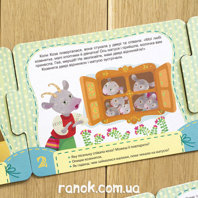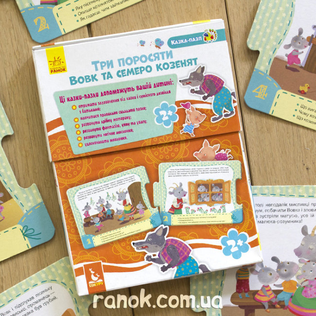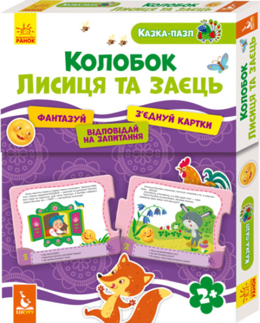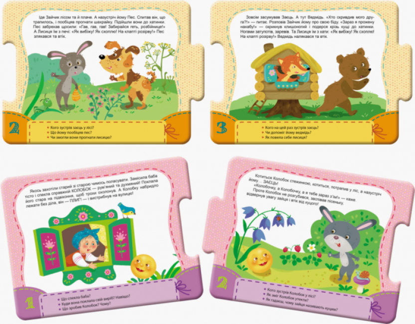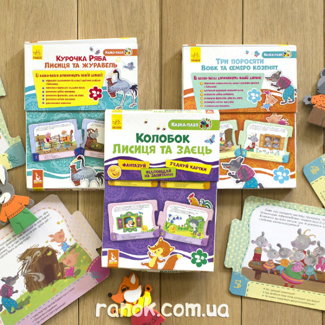 Відомі народні казки, адаптовані для малят, містять яскраві ілюстрації і прості зрозумілі тексти. Картки змодельовані таким чином, що, правильно з’єднавши пазли, можна дізнатися про сюжет казки. Набір складається з 5 двобічних карток. З одного боку зображено одну казку, а з другого – іншу. Крім того, на кожній карточці є кілька запитань до тексту. Це надасть можливості батькам виявити, чи зрозумів казку малюк. Не варто обмежуватися лише ними. Можна вигадати безліч запитань до малюнків. Картки спрямовані на розвиток логічного мислення, уважності, фантазії, а також на розвиток дрібної моторики.