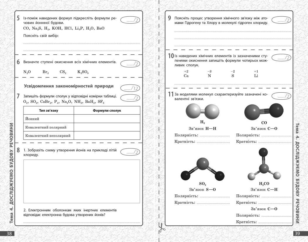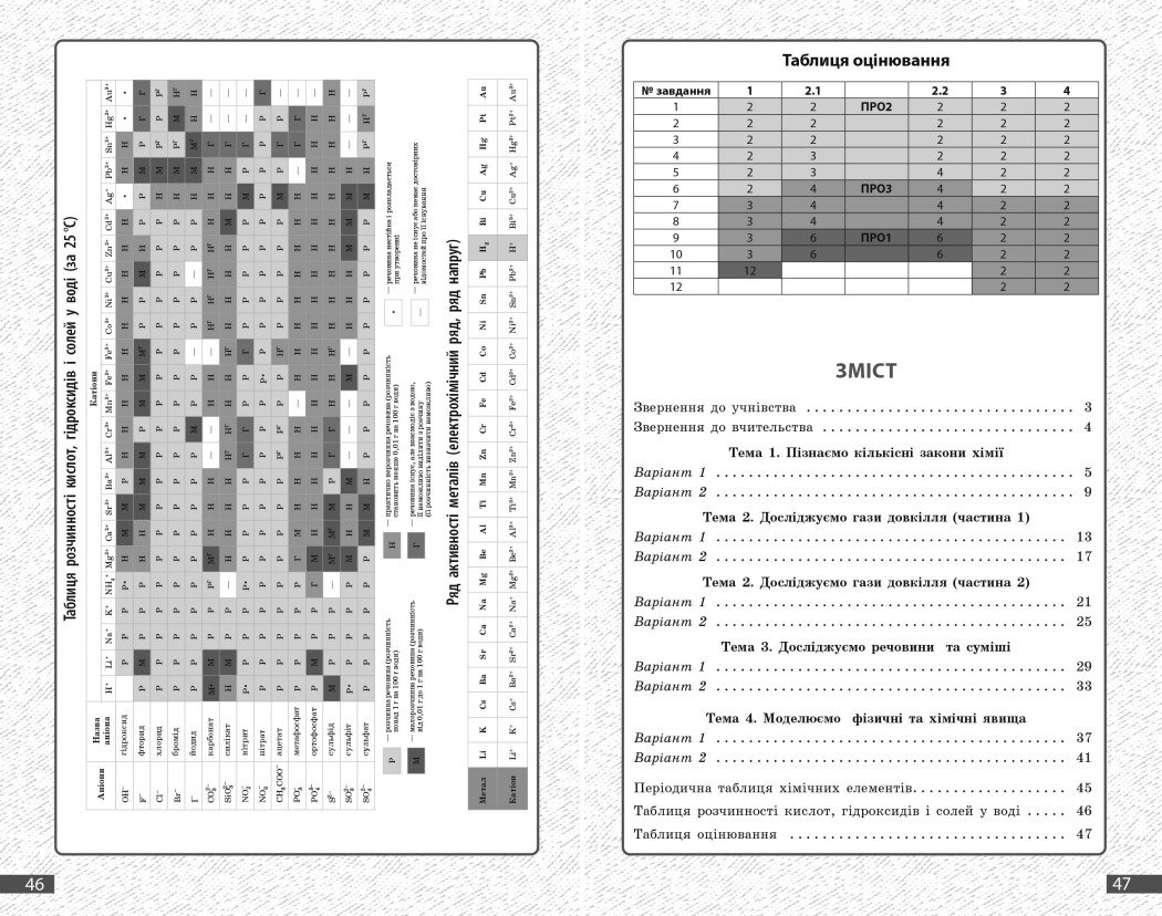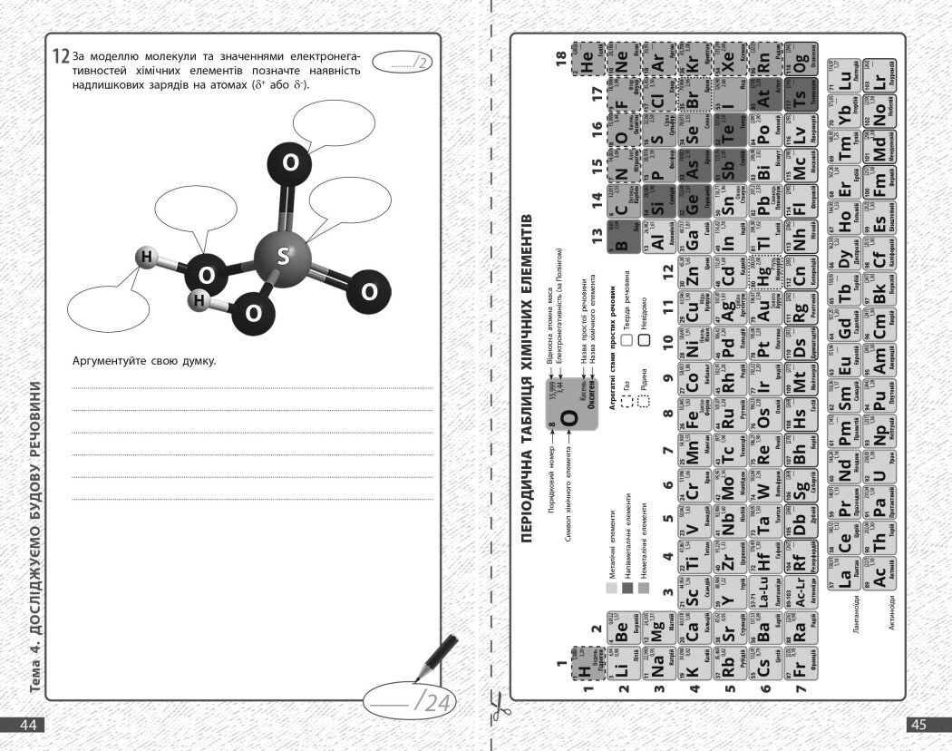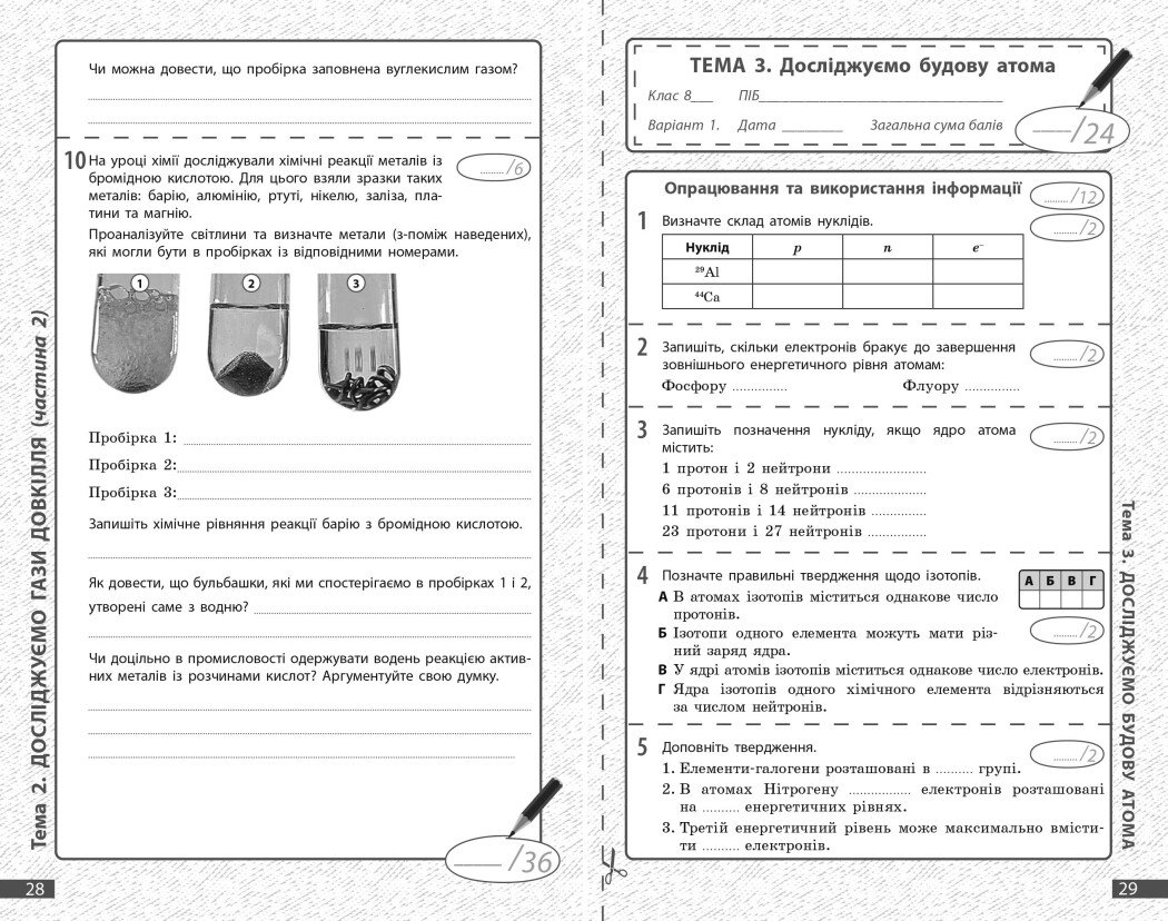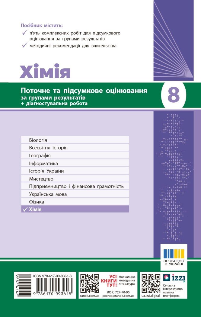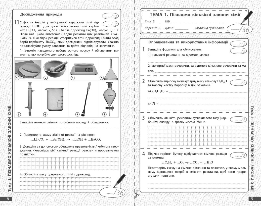 Посібник містить добірку завдань за групами результатів згідно з модельною навчальною програмою. Видання призначене для учнів і учениць 8-го класу ЗЗСО та вчителів / учительок хімії.