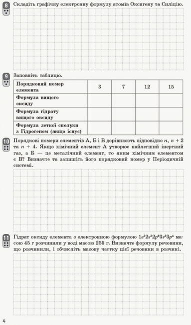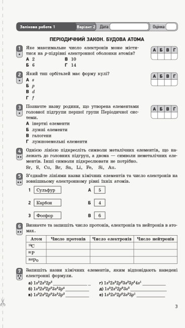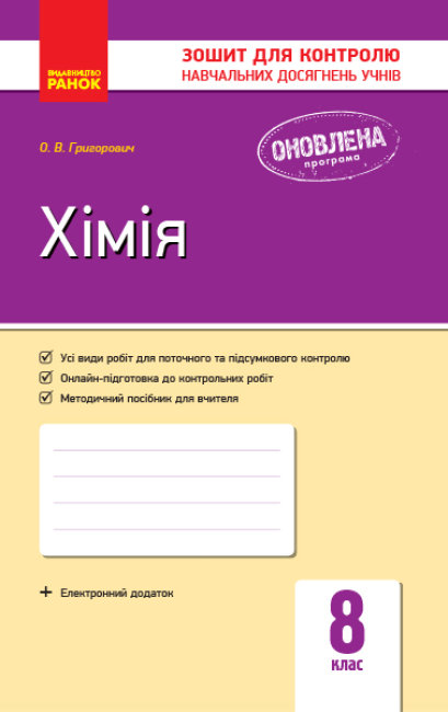 Зошит відповідає чинній програмі з хімії для 8 класу загальноосвітніх навчальних закладів з урахуванням останніх змін. Посібник містить різні форми контролю: залікові роботи з певної теми, а також тестові й самостійні роботи та бліцконтролі