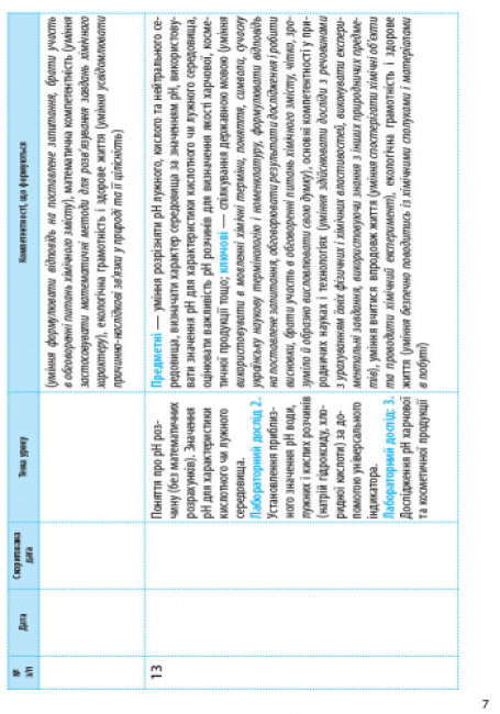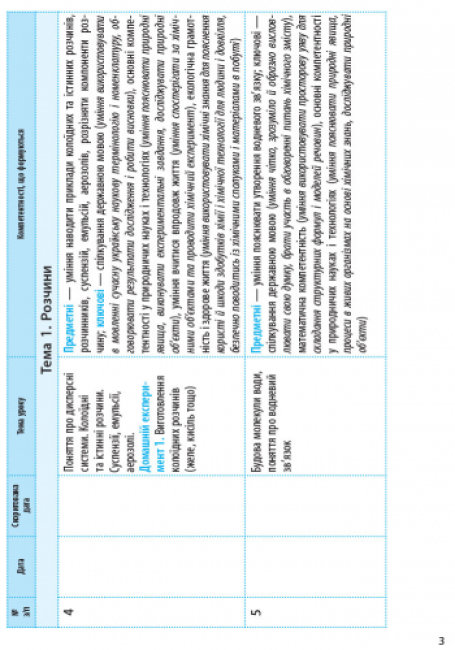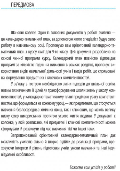 Запропонований календарно-тематичний план розроблено у відповідності до програми для загальноосвітніх навчальних закладів «Хімія» 7—9 класи (затверджена Наказом Міністерства освіти і науки України) з урахуванням засадничих ідей компетентнісного підходу в навчанні.
