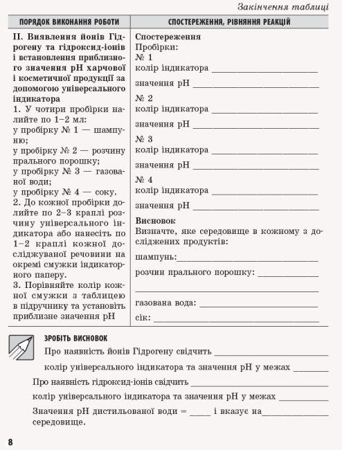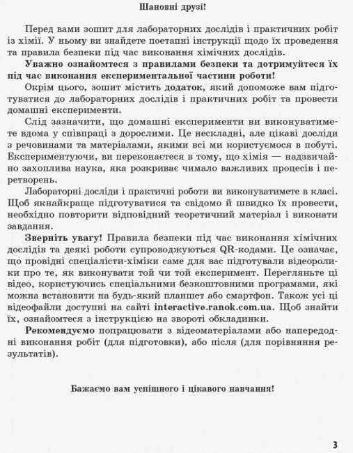Посібник містить лабораторні досліди і практичні роботи, передбачені чинною програмою з хімії для загальноосвітніх навчальних закладів. У зошиті наведено класичний варіант проведення робіт.