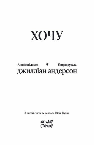 У цій визначальній для покоління книжці Джилліан Андерсон зібрала і представила анонімні листи сотень жінок з усього світу (разом зі своїм власним анонімним листом). «ХОЧУ» показує, як жінки ставляться до сексу, коли мають цілковиту свободу й анонімність.