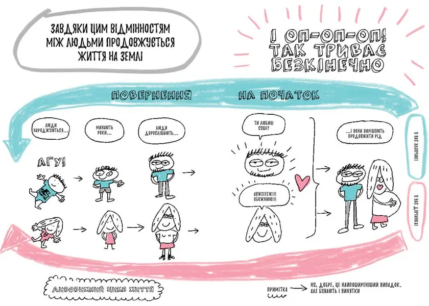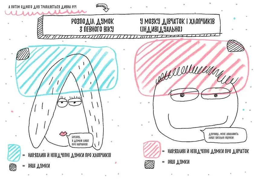 Пристебніться, ми вирушаємо у веселий та цікавезний світ дорослішання! Ми так швидко зростаємо! І з кожним роком запитань до батьків все більшає. Що таке пубертат? Чи правда, що всі наші переваги й вади залежать від особистості, а не від статі? Та як заговорити з отим дивостворінням за сусідньою партою… Для чого ми видали «Книжку, яка нарешті пояснить тобі геть усе про дівчаток і хлопчиків»: Ця весела книжка налаштує дітей на дружню розмову про стать. Франсуаза Буше легко та з гумором розповідає всю правду про дорослішання та зміни, яких зазнає організм. На прикладах авторка доводить, що кожне тіло — красиве і неповторне, тож не варто його соромитися. Вона допоможе дитині зрозуміти, що зовнішні та поведінкові метаморфози — це нормально і круто. Підкаже, як легко і просто подружитися з протилежною статтю, а також, що бути дівчинкою — не краще й не легше, ніж бути хлопчиком, і навпаки. Врешті-решт, ця дивовижна книжка допоможе дітям зібрати всі необхідні інгредієнти для порозуміння: рівність, повагу, згуртованість та спільні інтереси. Вирушаємо у подорож, дівчатка й хлопчики, вруууум…