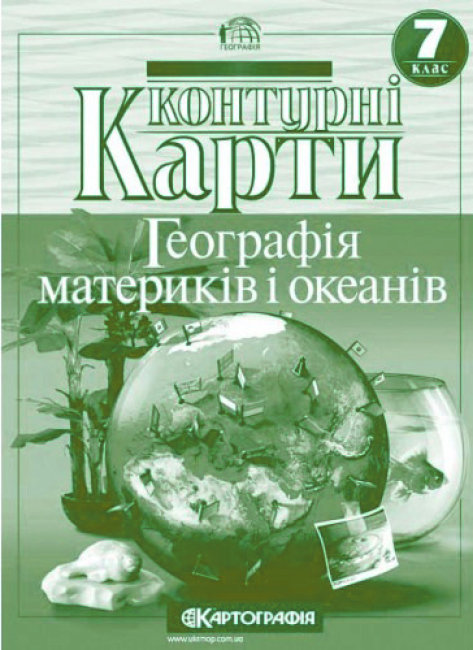 Спеціально розробленої контурні карти за новими стандартами для сучасних шкіл дванадцятирічного навчання, брошура призначена для учнів сьомого класу і містить карту світового океану, карти материків, кліматичні пояси та області світу.