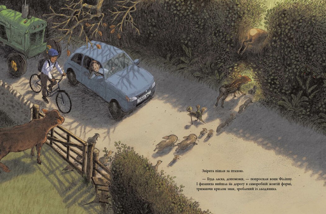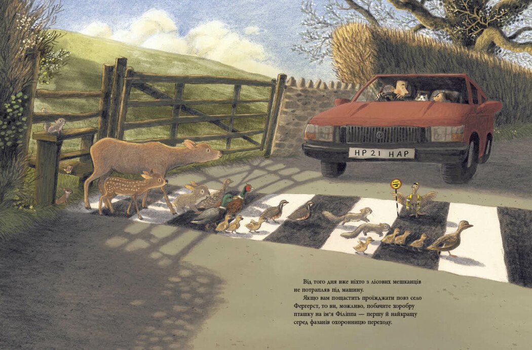 Філіппа Фазан — невелика, але розумна птаха з лісу біля села Фергерст. Усе в її житті непогано — тільки от щоразу, коли їй потрібно перейти Старий Дубовий шлях, вона ледь не потрапляє під машину. Філіппі це набридло! Розмірковуючи, що ж із цим вдіяти, вона випадково помітила дещо цікаве: висока жінка в яскраво-жовтій формі стояла посеред дороги та зупиняла машини за допомогою знака на палиці! Нічого подібного Філіппа зроду не бачила!