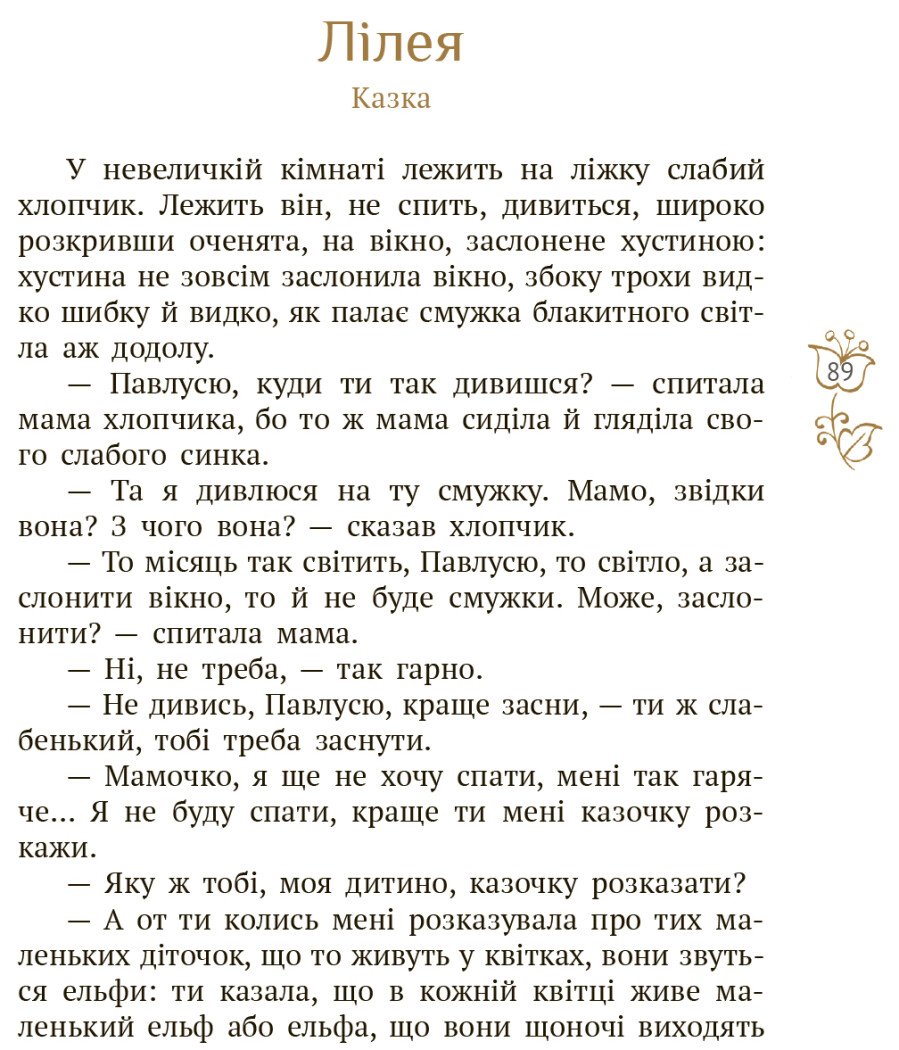 До збірки «Лелія» увійшли найкращі вірші та казки неперевершеної поетеси, письменниці, громадської діячки Лесі Українки, яка подорожувала світом і змінювала його на краще. У її творах дитина знайомиться із соціумом і спілкується з природою, веде постійний діалог з нею, є співучасником усього, що відбувається навколо. Поезії Лесі Українки співучі й мелодійні, вони є джерелом пізнання, у яких перемагає життєстверджувальний настрій. Читайте і насолоджуйтесь гармонією поетичного світу Лесі Українки.
