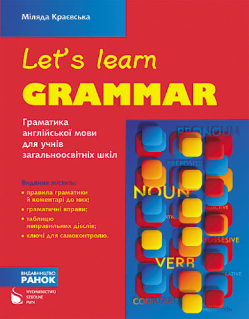 Посібник (автор Краєвська М.) містить правила англійської граматики, подані у наочній формі, вправи різних ступенів складності, що допоможуть відпрацювати й закріпити граматичний матеріал, і ключі для перевірки й самоконтролю. Видання укладено з урахуванням вікових особливостей учнів. Кумедні ілюстрації й римування, кросворди, ребуси, асоціограми, а також оригінальна форма подачі граматичного матеріалу зроблять процес навчання цікавим і захопливим.